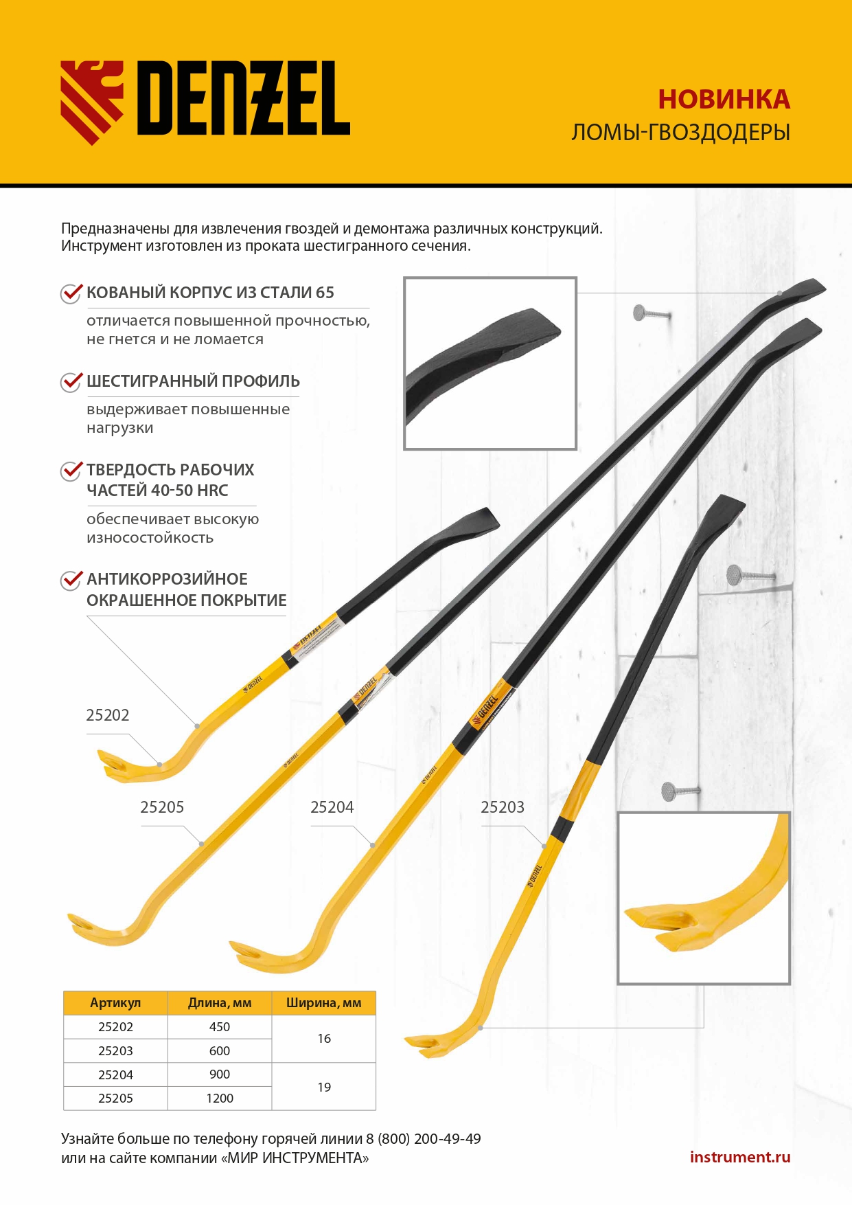 Лом-гвоздодер Denzel длиной 1200 мм, из стали 65, с шестигранным профилем размером 19 мм и окрашенной поверхностью, предназначен для извлечения гвоздей и демонтажа различных конструкций. Изготовлен из проката шестигранного сечения и выдерживает повышенные нагрузки. Инструмент используется для проведения ремонтных и демонтажных работ.
