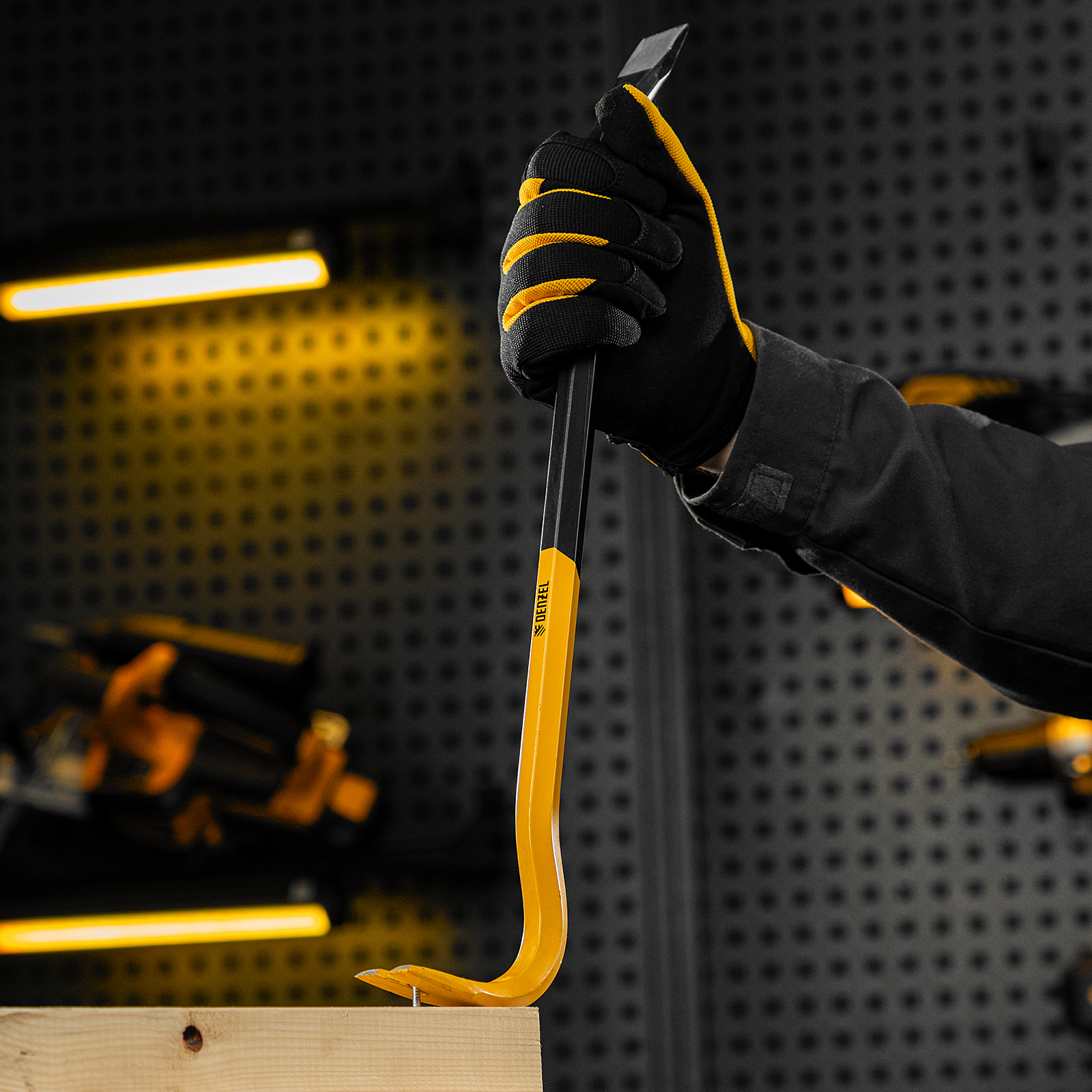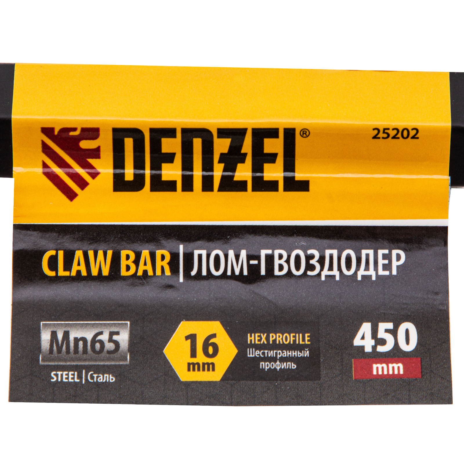 Лом-гвоздодер Denzel длиной 450 мм, из стали 65, с шестигранным профилем размером 16 мм и окрашенной поверхностью, предназначен для извлечения гвоздей и демонтажа различных конструкций. Изготовлен из проката шестигранного сечения и выдерживает повышенные нагрузки. Инструмент используется для проведения ремонтных и демонтажных работ.