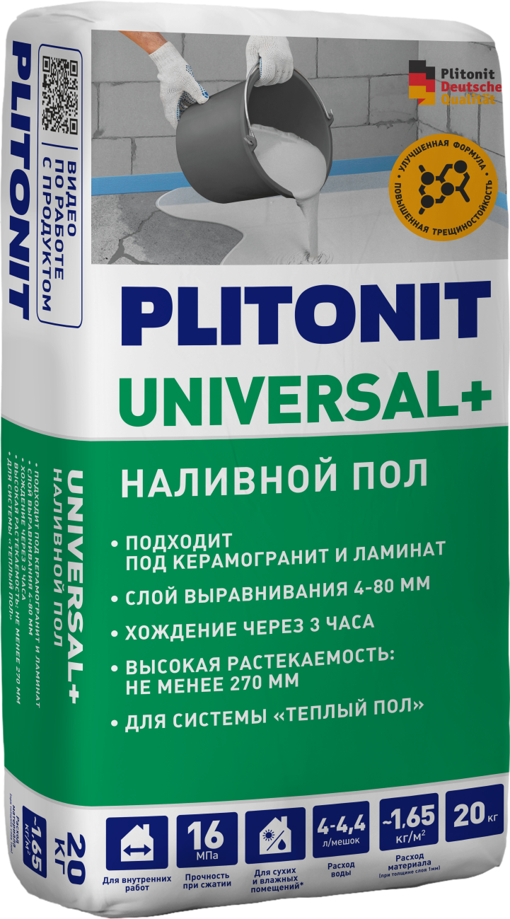 Быстротвердеющий самовыравнивающийся наливной пол Plitonit Universal+ предназначен для выравнивания и корректировки бетонных, цементных и гипсовых оснований перед укладкой финишных покрытий. Подходит для систем «тёплый пол». Универсальный состав позволяет выполнять как тонкослойное, так и грубое выравнивание полов толщиной от 4 до 80 мм (в углублениях до 100 мм). Обеспечивает прочное сцепление с основанием, быстрое твердение и ровную гладкую поверхность под ламинат, плитку, линолеум и другие покрытия. Соответствует ГОСТ 31358-2019.