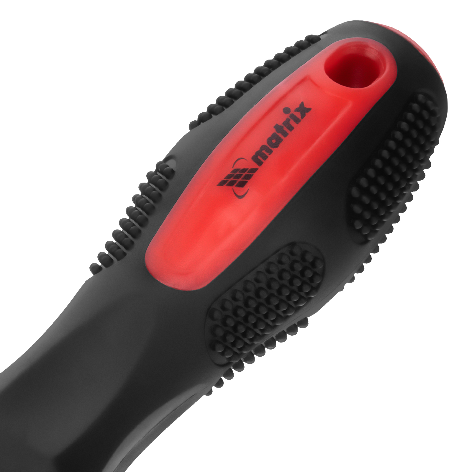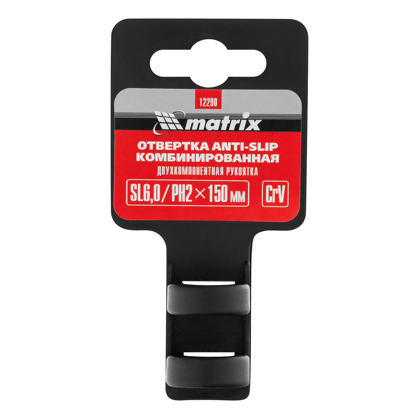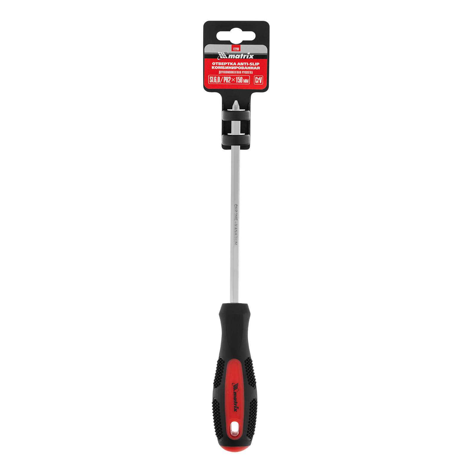 Комбинированная отвертка Matrix, SL6,0 / PH2 мм, из стали CrV, с антискользящей двухкомпонентной рукояткой, за счет двухстороннего стержня позволяет производить монтаж/демонтаж резьбовых соединений сразу двух типов: Slotted и Phillips. Она станет незаменимым инструментом для строителей, монтажников, слесарей и частных мастеров. Благодаря длине стержня 150 мм отвертка легко достает до крепежа в углублениях.