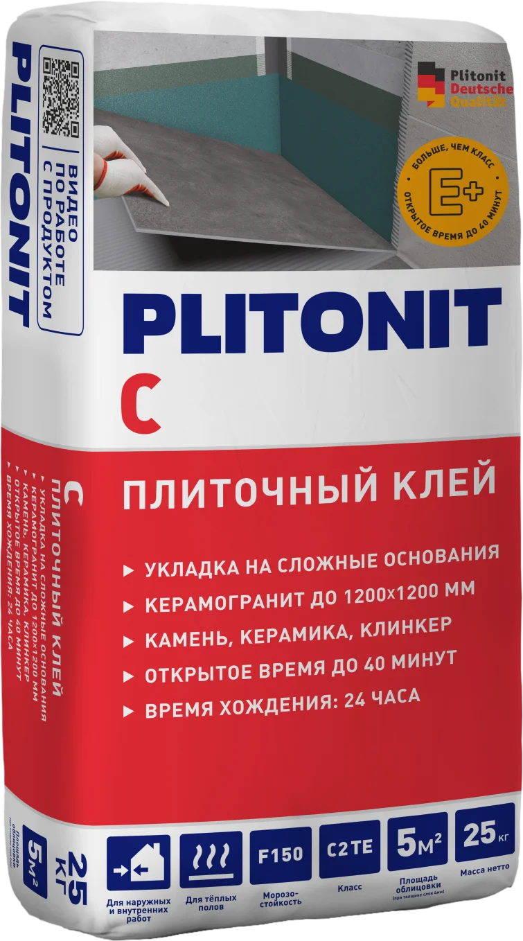 Универсальный клей Plitonit С предназначен для облицовочных работ всеми типами плитки, включая керамическую, керамогранитную, клинкерную и натуральный камень. Подходит для внутренних и наружных работ, а также для сложных оснований — бетон, гипсокартон, OSB, плитка по плитке, окрашенные поверхности, цементно-стружечные плиты. Отличается повышенной адгезией, водо- и морозостойкостью. Идеален для бассейнов, полов с подогревом и фасадных систем. Класс клея C2TE по ГОСТ Р 56387 гарантирует устойчивость к сползанию и длительное открытое время работы.